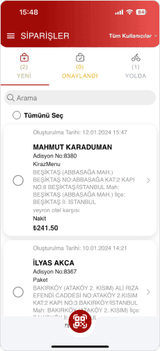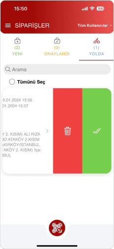 Kuryeler, QR kod taraması ile siparişleri kendilerine atayabilirler.