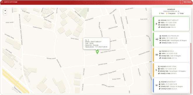 Kuryeler, siparişleri harita üzerinde anlık olarak görebilirler. Bu özellik, teslimat süreçlerini basitleştirir ve teslimat hızını artırır.
